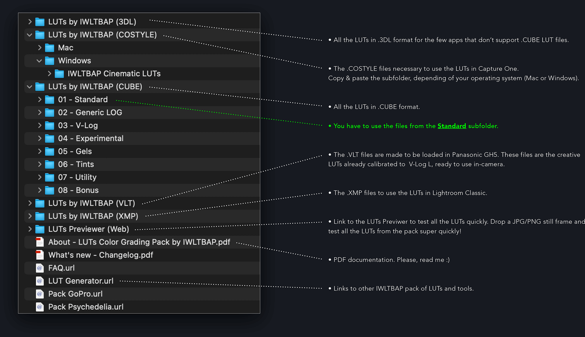 LUTs in the pack : standard, LOG, V-Log, tints, gels and utility LUTs.